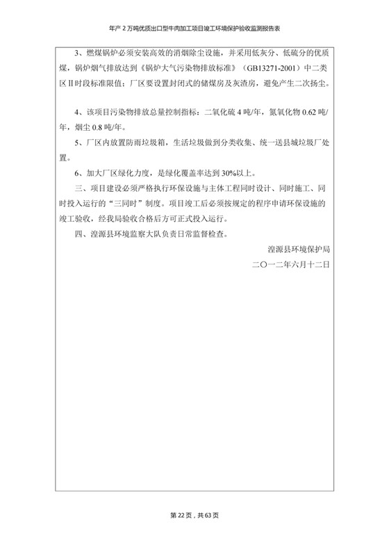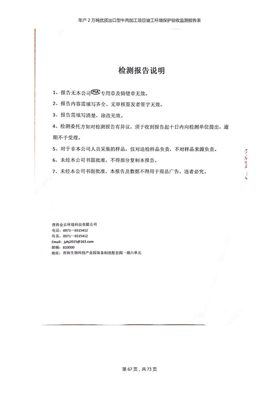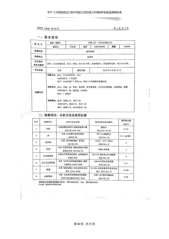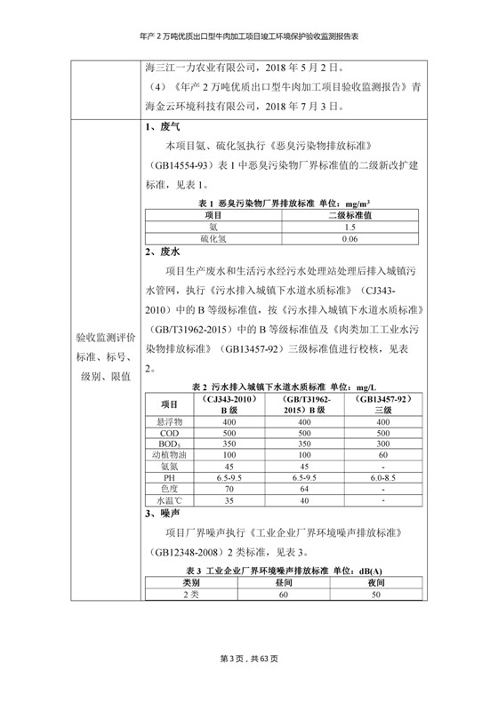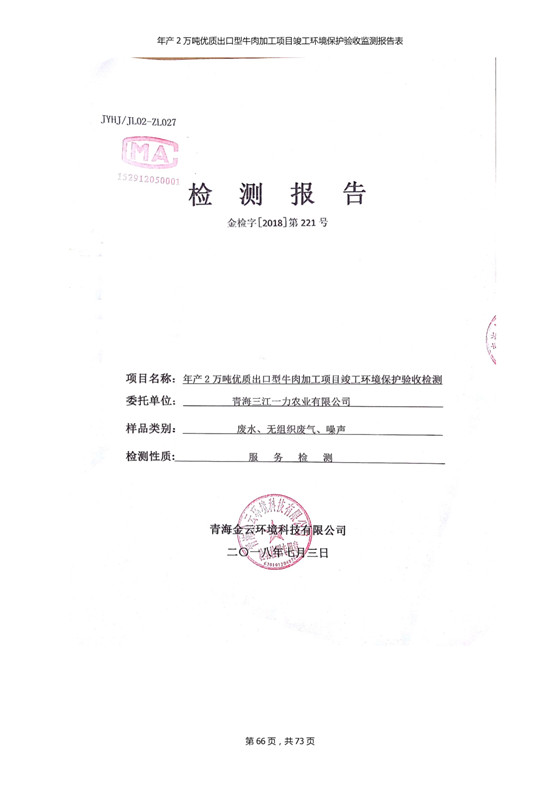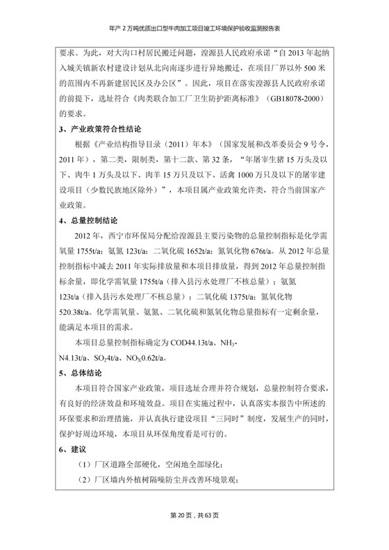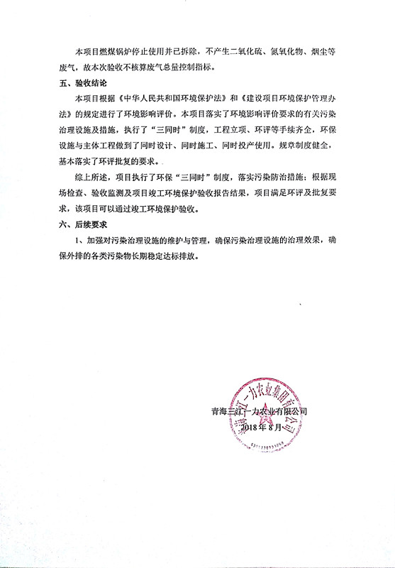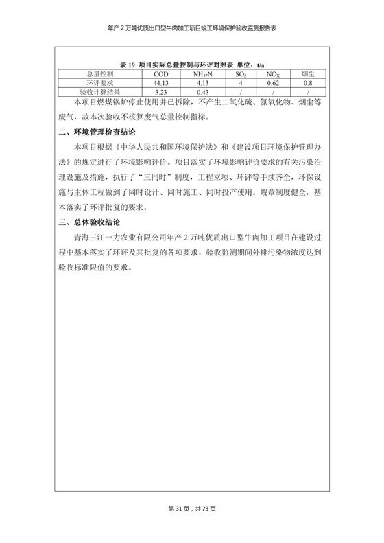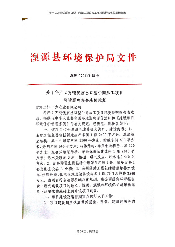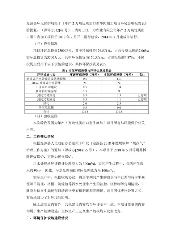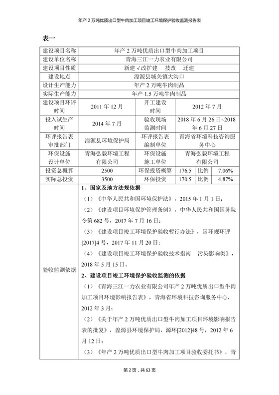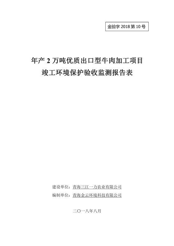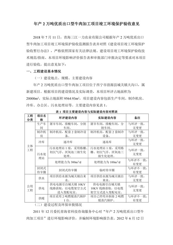 根據(jù)中華人民共和國國務院令第253號《建設(shè)項目環(huán)境保護管理條例》(中華人民共和國國務院令第682號《國務院關(guān)于修改〈建設(shè)項目環(huán)境保護管理條例〉的決定》和《建設(shè)項目竣工環(huán)境保護驗收暫行辦法》,嚴格依照有關(guān)法律法規(guī),建設(shè)項目環(huán)境保護設(shè)施驗收技術(shù)規(guī)范,本項目環(huán)評報告表和環(huán)保審批部門審批意見以及企業(yè)自行驗收相關(guān)要求等對本項目進行驗收,本項目符合環(huán)保驗收條件,可以通過環(huán)保驗收。 青海三江一力農(nóng)業(yè)有限公司組織召開年產(chǎn)2萬噸優(yōu)質(zhì)出口型牛肉加工項目(一期工程)驗收組意見.