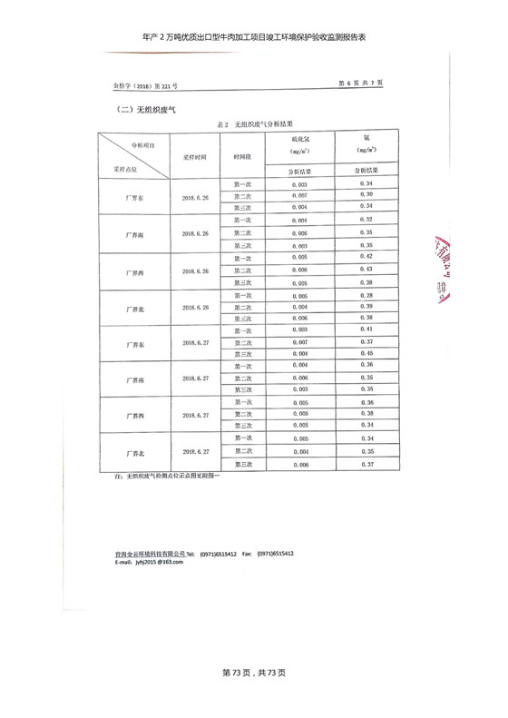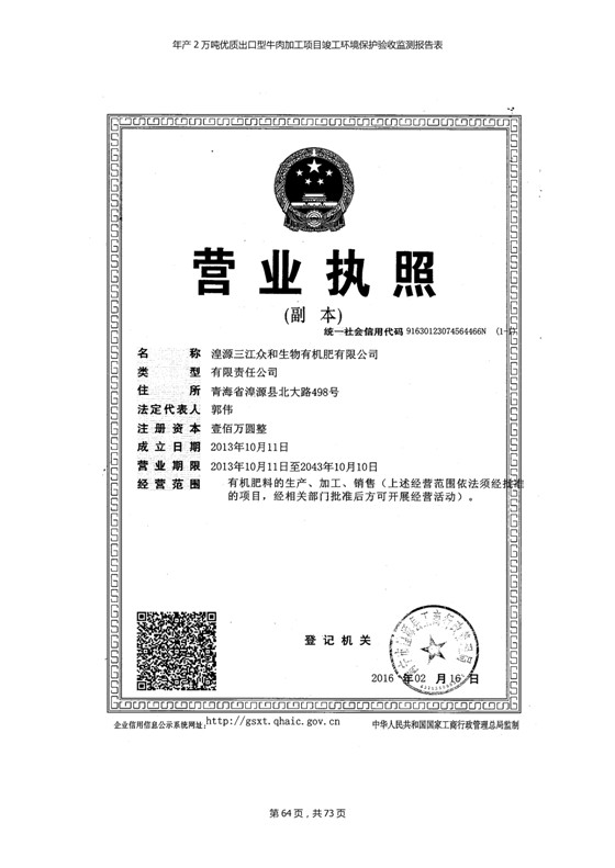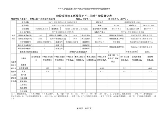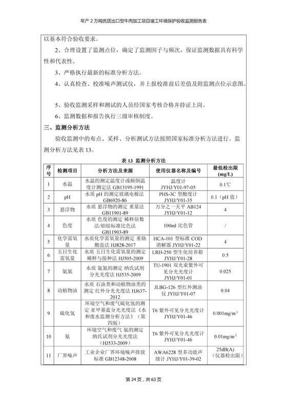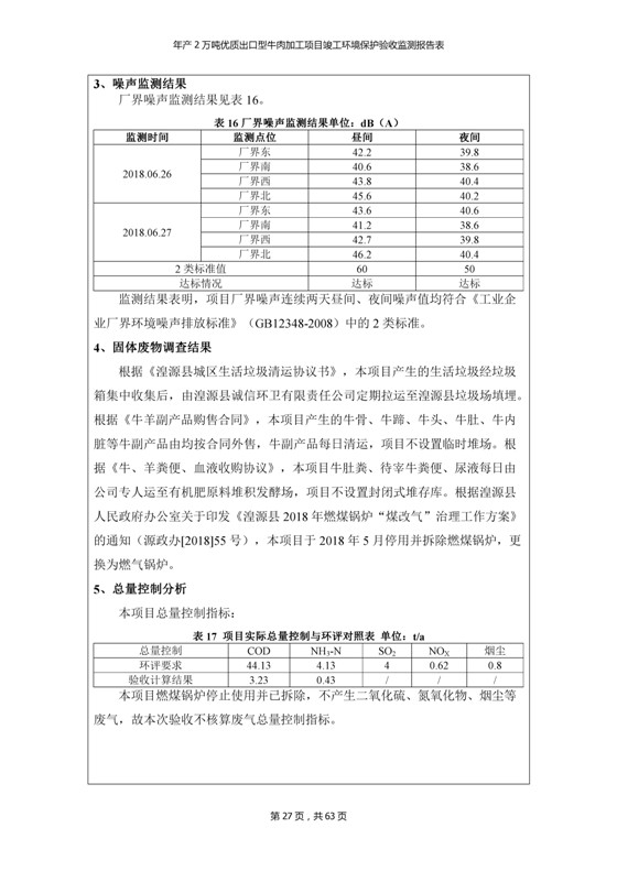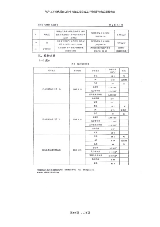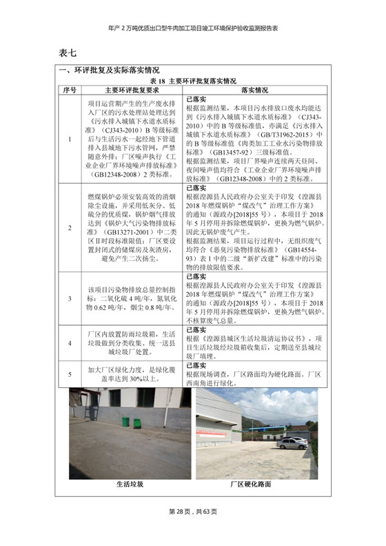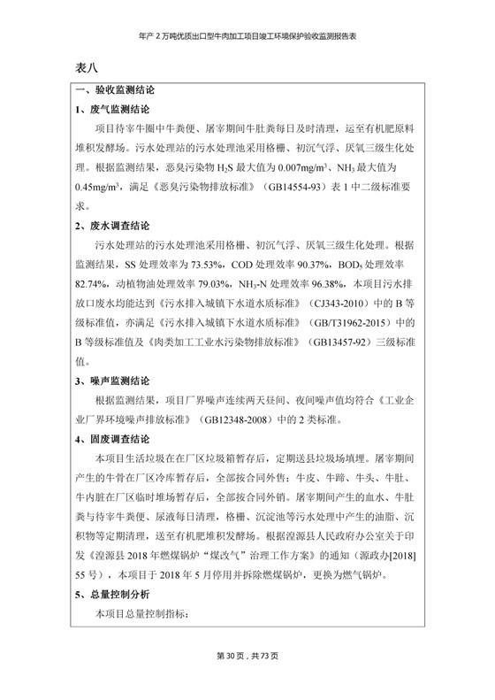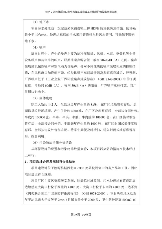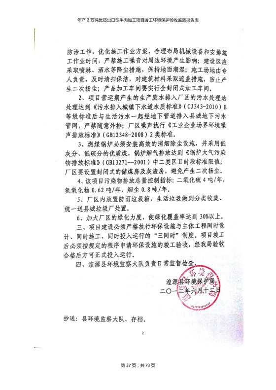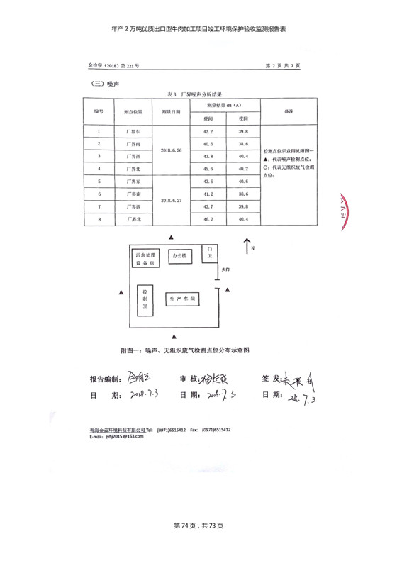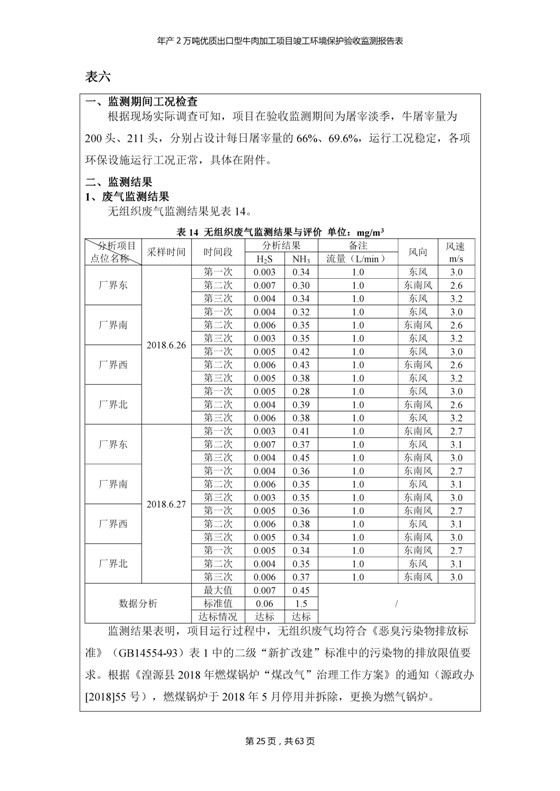 根據(jù)中華人民共和國國務院令第253號《建設(shè)項目環(huán)境保護管理條例》(中華人民共和國國務院令第682號《國務院關(guān)于修改〈建設(shè)項目環(huán)境保護管理條例〉的決定》和《建設(shè)項目竣工環(huán)境保護驗收暫行辦法》,嚴格依照有關(guān)法律法規(guī),建設(shè)項目環(huán)境保護設(shè)施驗收技術(shù)規(guī)范,本項目環(huán)評報告表和環(huán)保審批部門審批意見以及企業(yè)自行驗收相關(guān)要求等對本項目進行驗收,本項目符合環(huán)保驗收條件,可以通過環(huán)保驗收。 青海三江一力農(nóng)業(yè)有限公司組織召開年產(chǎn)2萬噸優(yōu)質(zhì)出口型牛肉加工項目(一期工程)驗收組意見.